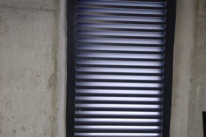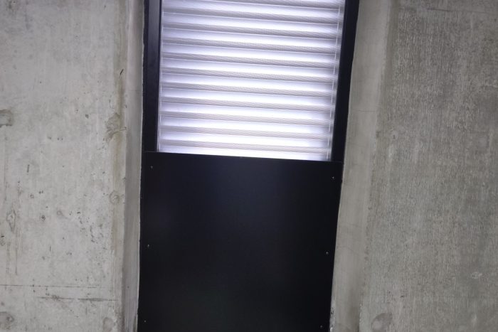マンションの機械室のアルミルーバー窓に 固定式網戸を取り付けました。 取り付け方法はサッシ枠にビスを打ち込み網戸を固定しました。 今回の網戸は少し特殊で上はネット、下はパネルの仕様になります。 管理組合様から雨が降った時に強風等で窓の下側から雨が打ち込んでくる 場合があるとの事で今回はその仕様にしました。